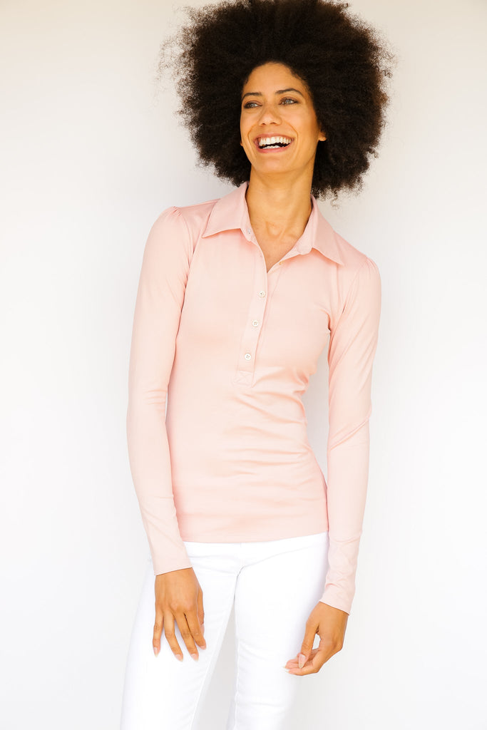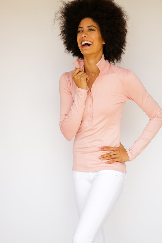 This is a really high quality shirt. The fit is great; I'm 5'9" 135 lbs and the medium is perfect. I especially love the length. The sleeves are long enough and the shirt itself easily tucks in. Perfect to wear to the office on a lesson day and have one less thing to change for the barn. I got the forest green and the dusty rose; both are very pretty, though a bit darker than they appear in the images.